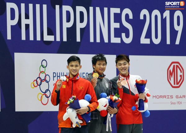 Thanh Bảo nhận HCB trong sự nuối tiếc của tuyển bơi Việt Nam, đi kèm là lời tán dương dành cho phong độ xuất thần của đối thủ đến từ Thái Lan. Ảnh: Hoàng Tùng