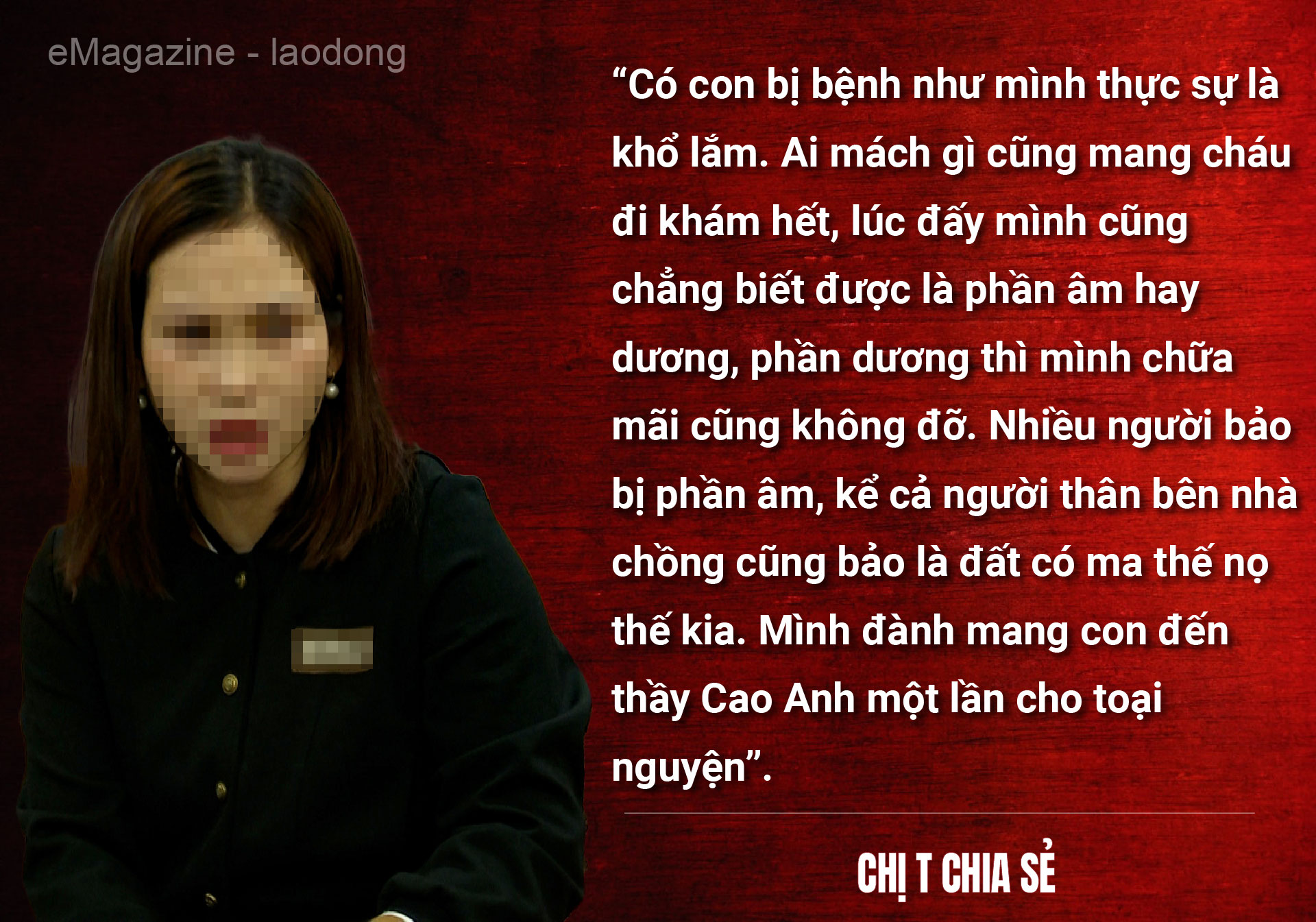 Đầu năm 2023, từ giới thiệu của em gái, chị T. biết đến thầy Cao Anh với khả năng chữa trị trầm cảm, tự kỷ bằng cách xem tử vi rồi bắt ma, trục vong... từ các clip trên mạng. Liên tiếp bị thúc giục bởi người thân, xem và đọc những bình luận từ các clip trên kênh YouTube, Facebook, Tik Tok có tên “Thầy Cao Anh” và “Học Cải Vận Mệnh”..., chị T. "nhắm mắt" đưa con đến Linh Quang Điện.