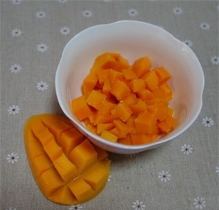 - Cắt nhỏ xoài thành miếng vừa ăn, bạn có thể cắt khối vuông 1cmx1cm.