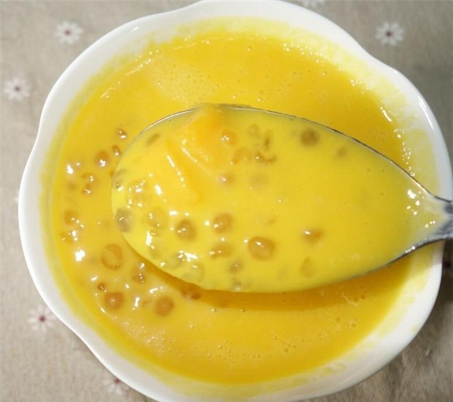 Đổ nước xoài vào trân châu. Sau đó cho thêm phần xoài cắt khối vuông vào bát. Vậy là món xoài sữa trân châu đã hoàn thành. Bạn có thể để lạnh hoặc cho thêm chút đá. Chắc chắn trong những ngày hè nóng nực này, món chè xoài trân châu sẽ khiến cả gia đình thích mê.