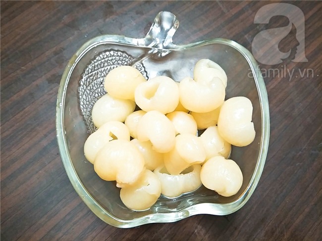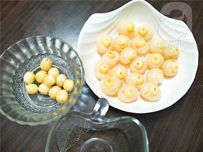Nhãn bóc vỏ và dùng dao nhọn lách xung quanh phần cuống quả nhãn, nhẹ nhàng lấy hạt nhãn ra sao cho cùi nhãn còn nguyên vẹn.
