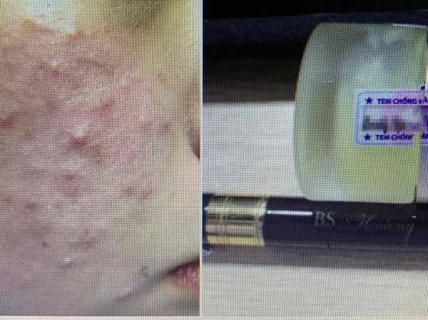 Cũng theo BS Tâm, ngày 9/12, bệnh nhân nữ trẻ tuổi tới khám vì mụn trứng cá, qua khai thác bệnh nhân cho biết được điều trị ở 1 cơ sở với phác đồ: nặn mụn và thuốc bôi. Thuốc bôi này có tem chống hàng giả khiến bệnh nhân yên tâm hơn. Tuy nhiên, quá trình điều trị không hiệu quả mà bệnh nhân xuất hiện thêm giãn mạch (da bị đỏ).