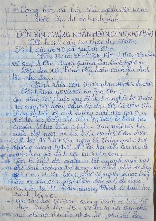 Hoàn cảnh đáng thương mà chúng tôi muốn nhắc đến là gia đình anh Đàm Văn Kim (SN 1978, trú tại xóm Thọ Nhân, xã Quỳnh Thọ, huyện Quỳnh Lưu, Nghệ An) có vợ là chị Trần Thị Sâm (SN 1978, đã mất) và hai con là Đàm Quang Thành (SN 2006) và Đàm Quang Vinh (SN 2010).