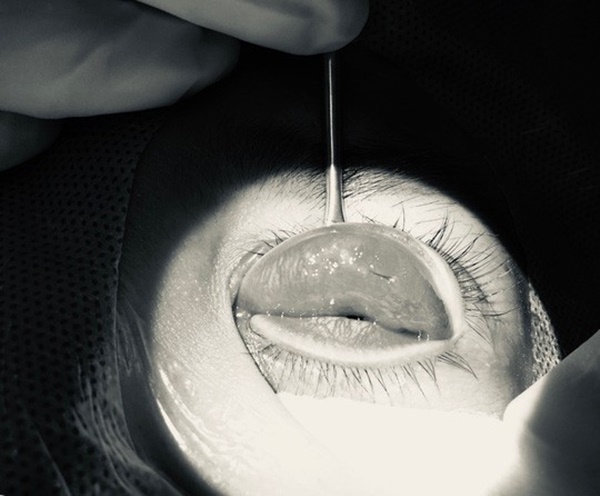 Bệnh nhân cho biết cách đây hơn 3 tuần, sau khi nhấn mí tại một cơ sở spa tại Lào Cai, cô bỗng thấy mắt trái nhìn mờ, đau nhức, chói cộm, mi phù nề... Phàn nàn với cơ sở spa về tình trạng này, cô được nhân viên ở đây tư vấn sử dụng kháng sinh, thế nhưng sau 3 tuần uống, tiêm kháng sinh, mắt cô ngày càng cộm, nhức nhối, sưng nề. Không chịu được, cô phải bắt xe về Hà Nội khám bệnh.