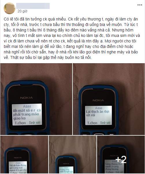 "Có lẽ tôi đã tin tưởng chồng quá nhiều. Chồng rất yêu thương tôi, ngày đi làm ăn ở công ty, tối ở nhà, trước tôi chưa bầu thì thi thoảng đi uống bia về muộn. 8 tháng bầu không đêm nào vắng nhà cả. Nhưng hôm nay, vô tình tôi mất sim, không chính chủ nên không làm lại được, tôi mua sim mới và vì chồng đi làm chưa về nên nhắn tin cho anh, kết quả là như thế này đây ạ.