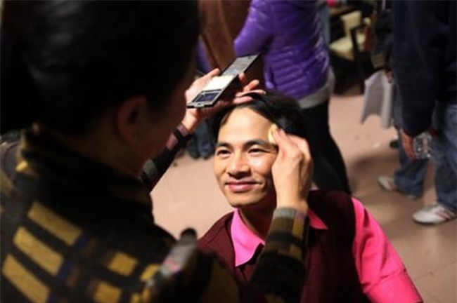 Giây phút hóa trang trong hậu trường, đôi khi để cho kịp giờ chính anh còn tự trang điểm luôn cho mình.