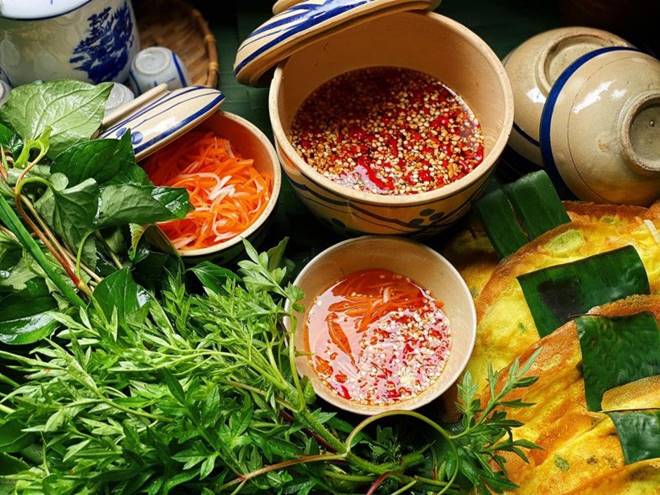 Cho bánh xèo ra đĩa, trình bày món bánh xèo với xà lách, rau cải xanh, rau thơm, đồ chua, chấm kèm nước mắm chua ngọt và thưởng thức ngay khi còn nóng là ngon nhất.
