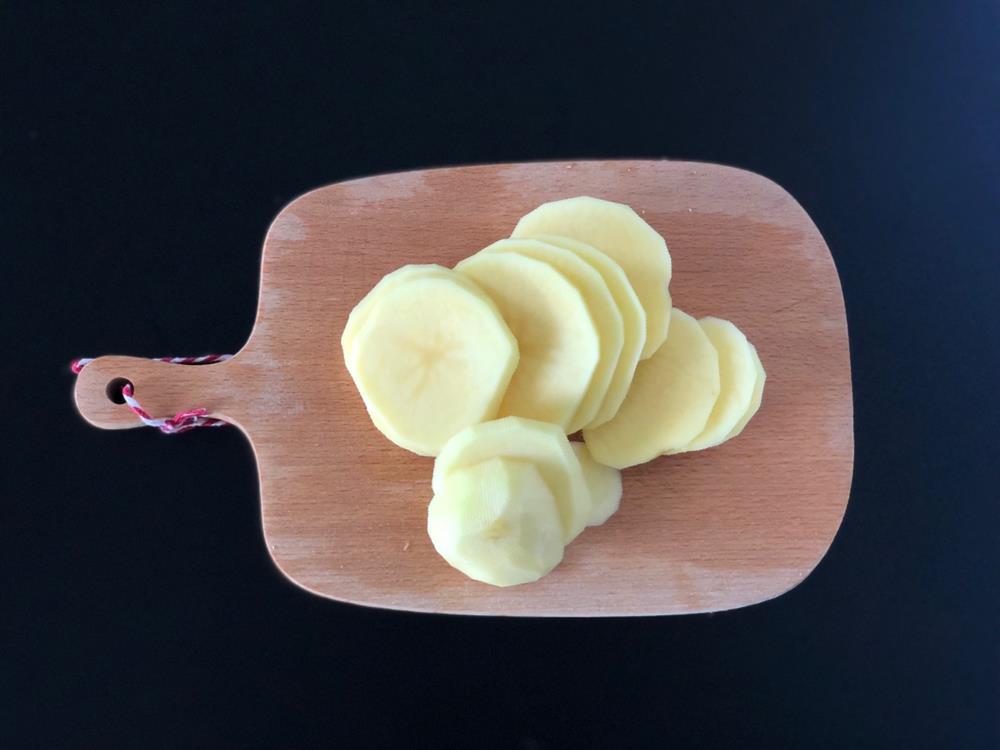 Khoai tây gọt vỏ rửa sạch sau đó thái lát. Hấp chín khoai rồi cho ra thố, nghiền nát khoai khi còn nóng.