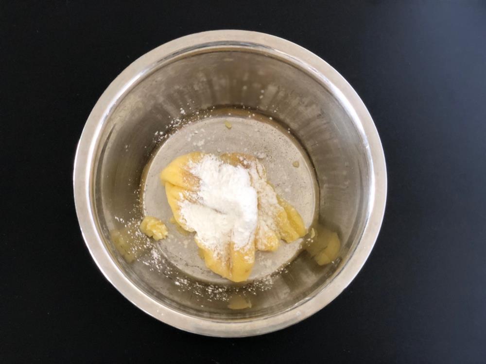 Thêm chút muối, bột tiêu vào trộn đều. Sau đó thêm ít một tinh bột ngô vào trộn chung, nhào cho bột thành khối dẻo mịn không dính tay là được.