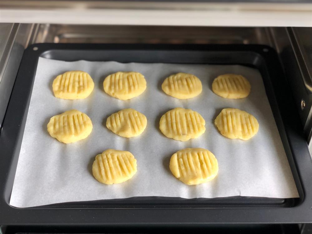 Dùng nĩa ấn vào từng chiếc bánh để tạo đường vân trên bánh. Dùng cọ quét một lớp mỏng dầu ăn lên trên bề mặt bánh. Đặt khay bánh vào lò nướng, nướng bánh ở 180 độ C trong khoảng 20 phút, hoặc cho đến khi bánh chín vàng đều là được.