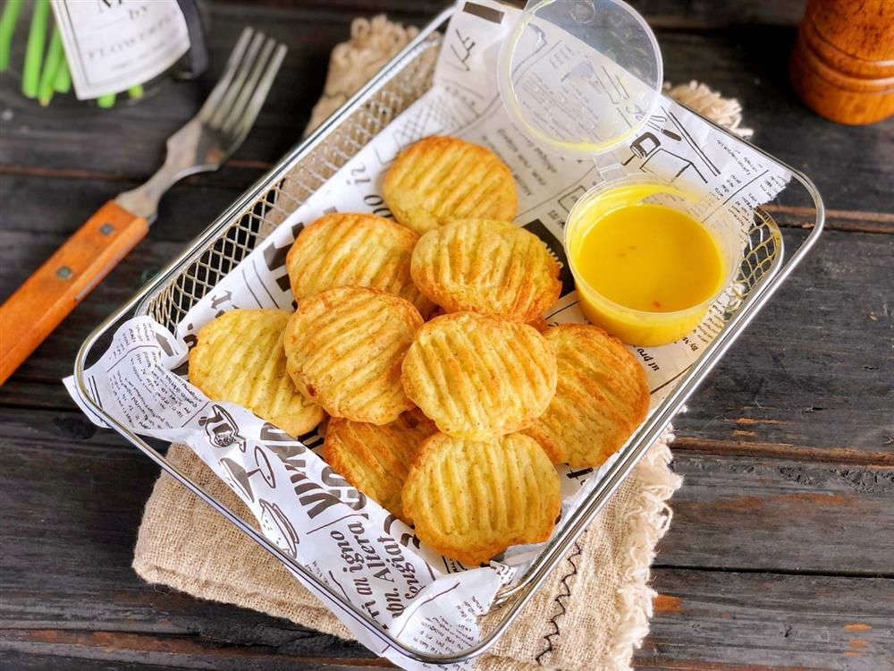 Từng chiếc bánh khoai tây nhỏ xinh với lớp vỏ ngoài giòn giòn, bên trong lại thơm bùi ăn rất ngon miệng. Bánh khoai tây được làm theo cách trên đây còn rất tốt cho sức khỏe nữa đấy. Nếu bạn không có lò nướng thì hãy chiên bánh trong nồi chiên không dầu nhé. Bánh sau khi nướng chấm kèm với tương ớt, tương cà hay các loại sốt khác đều rất hợp.