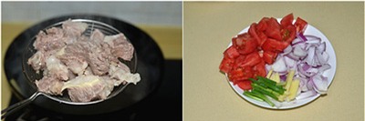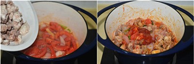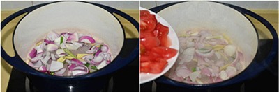 ![]() | ![]() Làm nóng nồi đáy dầy với chút dầu láng mặt, trút đầu hành trắng, gừng và hành tây vào xào thơm. Khi hành tây bắt đầu trở nên trong thì mới trút cà chua vào xào chung. |