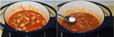 ![]() | ![]() Khi cà chua đã được xào mềm, trút thịt bò vào đảo chung. Thêm rượu vang, nước sốt cà chua, và hắc xì dầu vào đảo đều. Đổ thêm 1 bát con nước sôi vào, chờ nước sôi lại thì đậy vung, hạ nhỏ lửa đun liu riu chừng 1 giờ. Nếu có nồi áp suất hoặc nồi hầm điện, bạn có thể trút sang để đun ở bước này để tiết kiệm thời gian và nhiên liệu. |