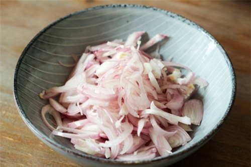 Bước 2: Đun nóng một chén dầu trong chảo, sau đó cho hành củ vào xào cho đến khi có màu nâu vàng, đảo liên tục. Cho hành ra để nguội. Khi nguội, hành phi khá giòn, cho vào túi nilon rồi dùng chày cán nhỏ.