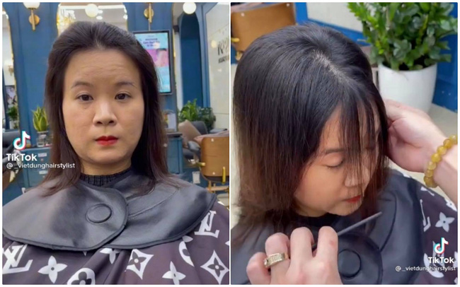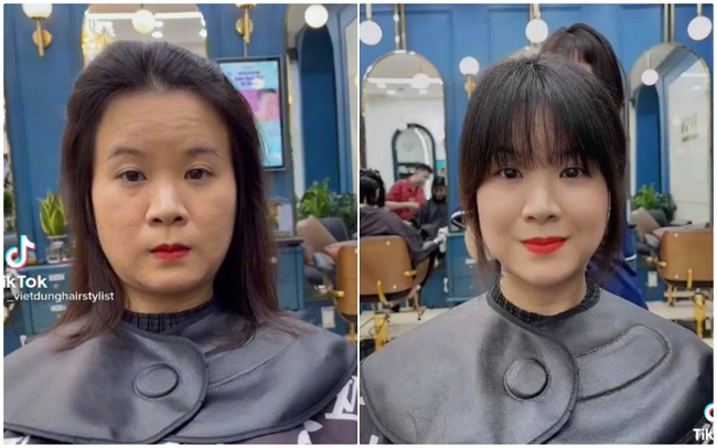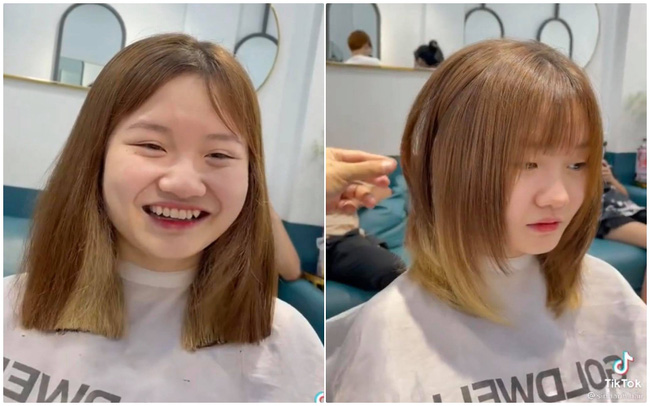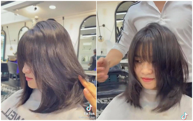 Đang từ mái tóc dài để đơn thuần và đương nhiên lộ hết nhược điểm mặt to và vuông, cô nàng được stylist chỉnh sửa lại mái tóc với phần tóc mái rủ nhẹ, tóc hai bên tỉa layer ngắn ôm lấy khuôn mặt để che đi phần má và phần cằm bè ra 2 bên (Nguồn: Hair Salon Sinh Anh).