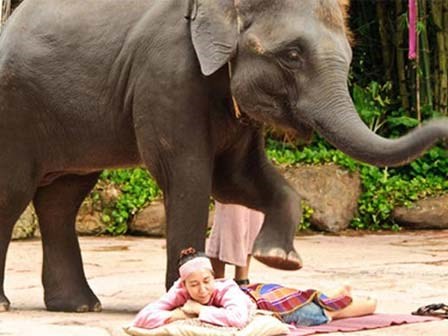 Chú voi nặng hàng tấn đặt chân lên người để mát-xa cho một người phụ nữ khiến người xem nổi da gà.