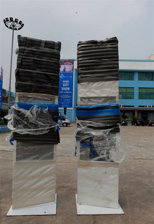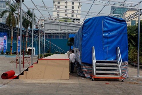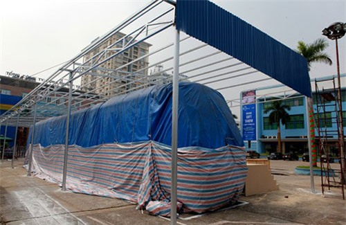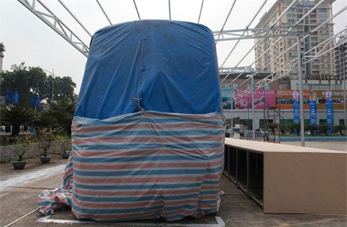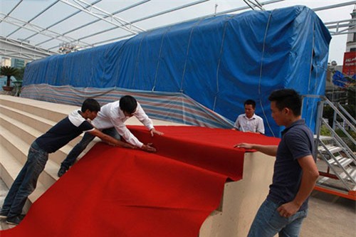 Mẫu tàu điện tuyến đường sắt đô thị Cát Linh - Hà Đông đang được phủ bạt tại Trung tâm Triển lãm Giảng Võ (Hà Nội). Dự kiến chiều mai, 27.10 sẽ mở phủ bạt cho người dân đến chiêm ngưỡng, thăm quan. Thời gian trưng bày kéo dài 3 tháng.