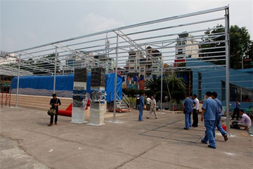 Công nhân đang hoàn thiện phần mái che |