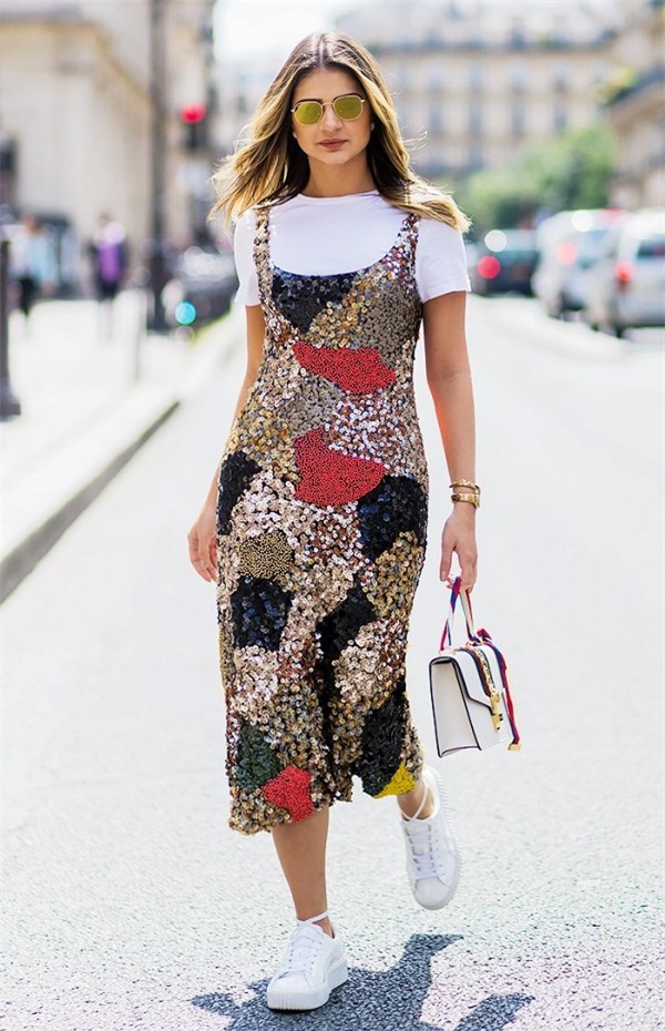 Giày thể thao sẽ tôn vinh sự phóng khoáng, tiện dụng và cá tính khi kết hợp cùng chiếc váy slip dress.