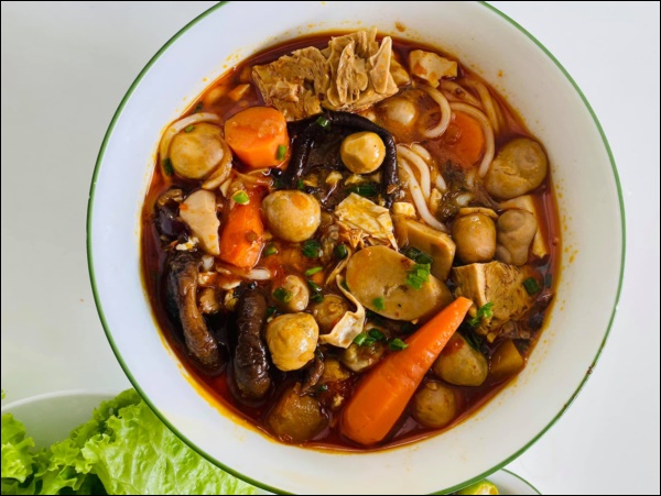 Bát bún màu sắc đẹp mắt với rất nhiều nấm, rau củ tươi ngon, bổ dưỡng, tốt cho sức khỏe.