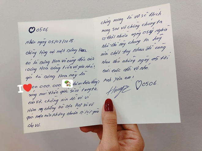 Chồng mong là vợ sẽ thích. Mong sao vợ chồng chúng ta có thật nhiều ngày 05 ý nghĩa như thế này. Chúng ta hãy nắm chặt tay nhau để cùng nhau đón những ngày 05 tới cuối cuộc đời vợ nhé. Anh yêu em!".