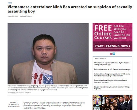 Ở thời điểm hiện tại, rất nhiều báo điện tử đưa tin về sự vụ Minh Béo có hành vi quấy rối tình dục trẻ em. Trong số đó, rõ ràng và đầy đủ thông tin nhất phải kể đến bài báo của tờ Ocregister- một trang điện tử địa phương của quận Cam, bang California, Mỹ. Bài báo với nhan đề "Vietnamese entertainer Minh Beo arrested on suspicion of sexually assaulting boy" (Tạm dịch: Nghệ sĩ Việt - Minh Béo bị bắt vì tình nghi xâm hại tình dục bé trai) có đoạn viết: " Một nghệ sĩ Việt nổi tiếng đến từ Garden Grove đã bị tình nghi tấn công tình dục một bé trai đầu tháng này, thông tin chính thức được công bố bởi nhà chức trách hôm thứ hai ngày 28/03/2016.