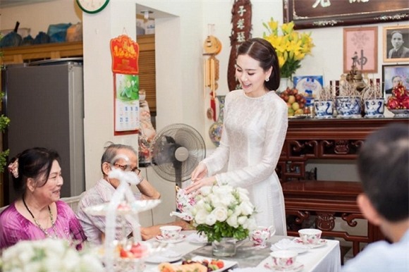 Trong lễ ăn hỏi của mỹ nhân thời tiết Mai Ngọc, Hoa hậu Việt Nam 2010 Ngọc Hân đã đến sớm, cùng cô dâu chuẩn bị và sắp xếp công việc trong ngày trọng đại này.