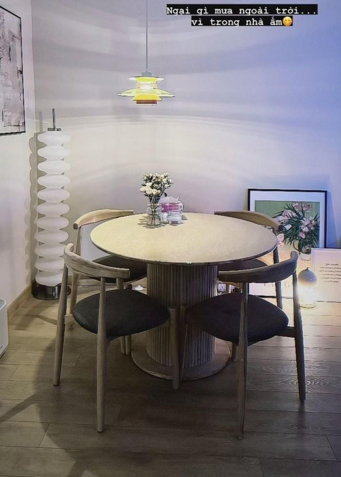 Bàn ăn tròn nhỏ nhắn nhưng ấm cúng, nơi Mai Ngọc thường quây quần bên gia đình và bạn bè. Có thể thấy, cách bài trí nội thất của Mai Ngọc khá tinh tế, nhẹ nhàng.
