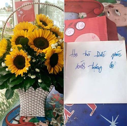 "Nhìn giỏ hoa, xem tấm thiệp nhỏ và dòng chữ của Đức Phúc, mắt mình bỗng cay.Cảm ơn Con nhiều Đức Phúc. Cô thấy rất ấm lòng ..Con còn nhỏ nhưng cách sống của con gây ấn tượng quá lớn cho cô. Có lẽ đối với con, con luôn sống đúng với câu: Một Ngày cũng là Thầy - là Cô. Cô luôn trân trọng điều này từ con và từ những ai sống có Nghĩa ..."