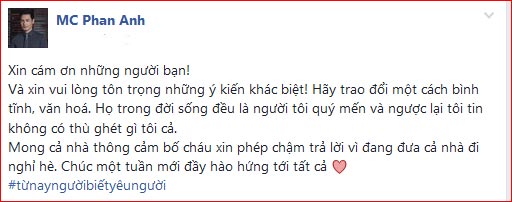 Trước sự “phẫn nộ” của cộng đồng mạng, mới đây, MC Phan Anh đã chính thức lên tiếng trên trang cá nhân. Nam MC cho biết: