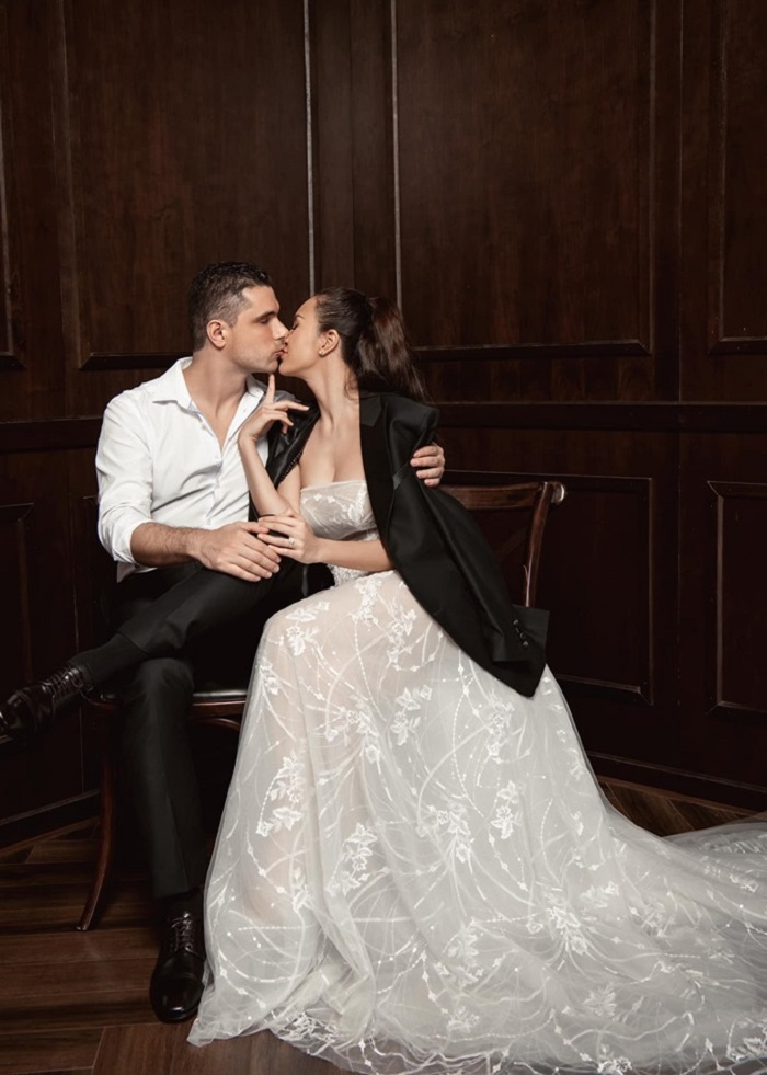 Tối 7/6, MC/người mẫu Phương Mai hạnh phúc khoe với khán giả những hình ảnh đầu tiên trong bộ ảnh cưới của cô. Không chọn bối cảnh cầu kỳ, cặp đôi thực hiện ảnh cưới trong studio nhưng vẫn rất lãng mạn, ngọt ngào. MC Phương Mai diện váy cúp ngực, khoe vai trần quyến rũ tình tứ hôn chồng sắp cưới.