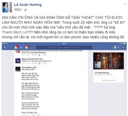 Không dừng lại ở đó, vợ cũ của nam MC còn chụp lại màn hình lời thơ của ông và lời đáp trả của bà, sau đó đăng tải trên trang facebook cá nhân kèm lời viết đầy bức xúc: "Xin cảm ơn ông và gia đình ông đã giải thoát cho tôi được làm người như ngày hôm nay. Trong suốt 20 năm trời, ông có "bố thí" cho tôi một chút tình nào đâu mà "nếu tình yêu đã mệt ...? Nên nhớ rằng dù có làm từ thiện bao nhiêu đi nữa nhưng chỉ cần ác với một người thì có làm phước bao nhiêu cũng không đủ".