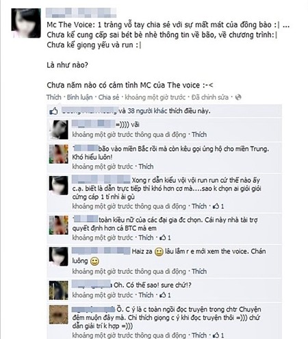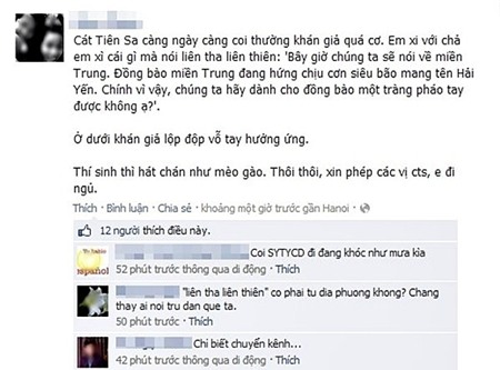 Sau khi nói về những chia sẻ của chương trình và hoạt động từ thiện của các thí sinh vừa qua, Yumi Dương tiếp tục: “Xin khán giả một tràng pháo tay cho các thí sinh trong chương trình cũng như đồng bào miền Trung đang chịu bão lũ” và ở dưới là những tiếng vỗ tay gượng gạo của một vài khán giả.