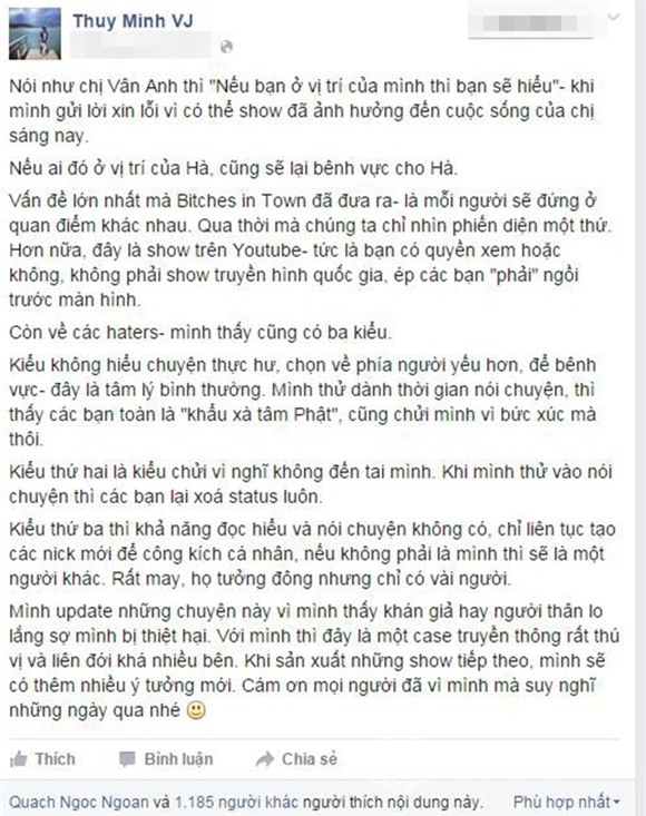 MC Thùy Minh viết: "Nói như chị Vân Anh thì "Nếu bạn ở vị trí của mình thì bạn sẽ hiểu"- khi mình gửi lời xin lỗi vì có thể show đã ảnh hưởng đến cuộc sống của chị sáng nay.