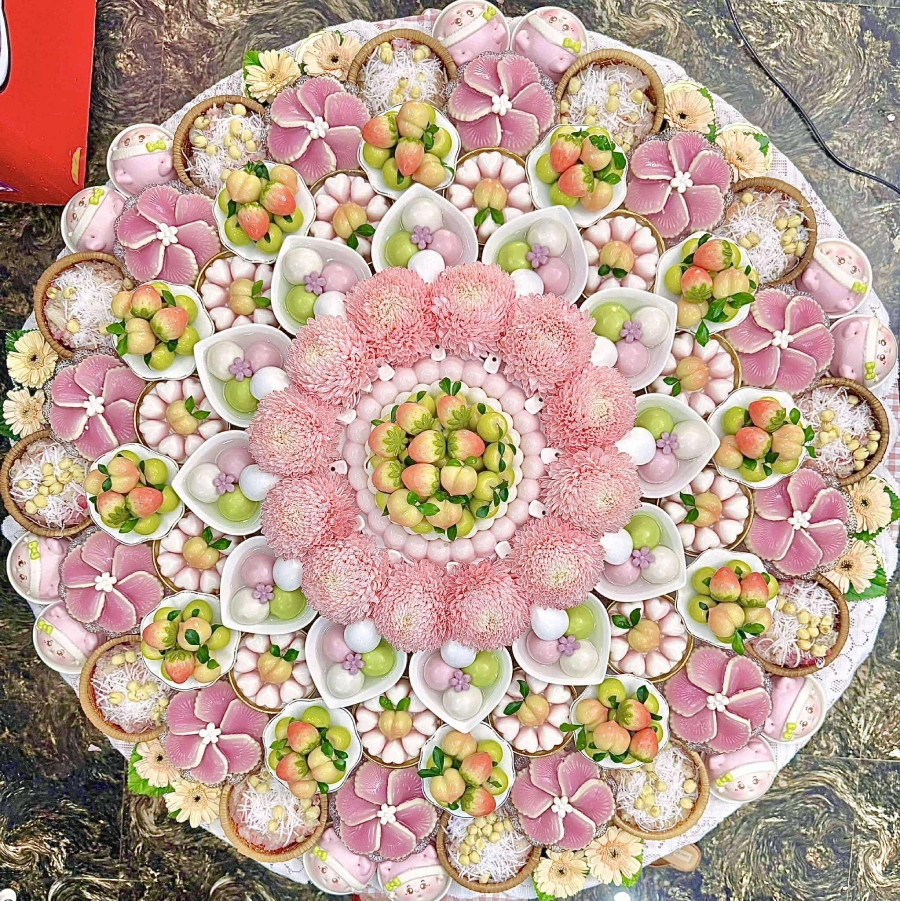 Một mâm lễ hoàn chỉnh không chỉ có xôi, chè trôi, rau câu mà còn có cả bánh su kem, tháp donut, cookie vẽ tay… đủ đầy, tinh tế, màu sắc hài hòa. Theo chị Nga, việc phối màu và sắp xếp mâm lễ là điều quan trọng, thu hút sự chú ý.