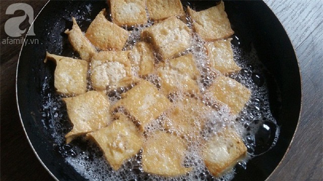 Đậu phụ cắt miếng vuông rồi chiên vàng đều hai mặt.