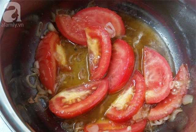 Phi thơm hành cùng chút dầu ăn, cho cà chua vào đảo đều. Khi cà chua chín mềm thì cho phần nước luộc ốc vào nồi. Có thể thêm nước lọc để phù hợp với lượng người khi ăn.