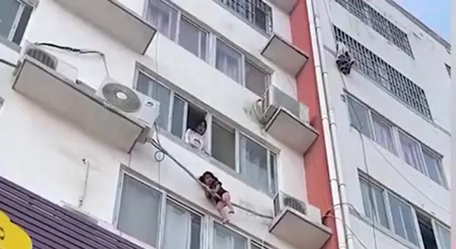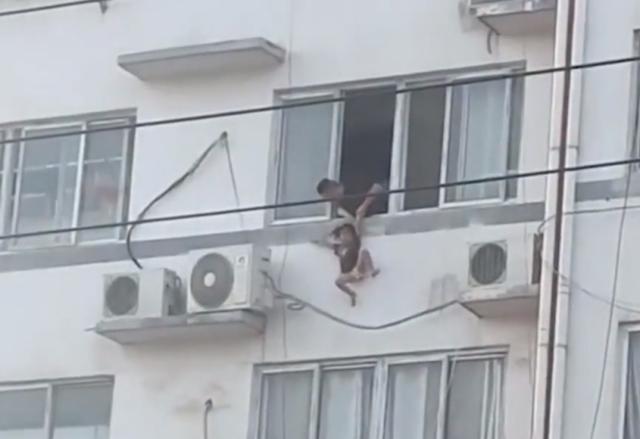 Người mẹ gần như tuyệt vọng, vừa khóc vừa kêu cứu vì không thể cứu được con. May mắn thay lúc này một người đàn ông họ Triệu đã nhanh chóng chạy lên lầu đề nghị giúp đỡ. Dưới sự hỗ trợ của một vài người, anh Triệu đã thành công kéo được đứa trẻ vào nhà an toàn.