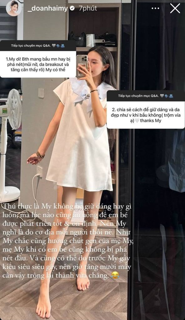 Mới đây, khi tâm sự cùng người hâm mộ trên mạng xã hội, mẹ bầu Doãn Hải My nhận được câu hỏi về việc giữ dáng và da khi mang thai để không bị "phá nét" như mũi nở, da kích ứng nổi mụn và tăng cân thấy rõ... Bà xã Đoàn Văn Hậu chia sẻ: "Thú thực là My không hề giữ dáng hay gì luôn, mà lúc nào cũng ăn uống để em bé được phát triển tốt và ổn định. Nên My nghĩ là do cơ địa mỗi người thôi nè. Như My chắc cũng hưởng chút gen của mẹ My. Mẹ My khi có em bé cũng không bị phá nét đâu. Và cũng có thể do trước My gầy, kiểu siêu siêu gầy, nên giờ tăng mười mấy cân vậy trông lại thành vừa chăng"