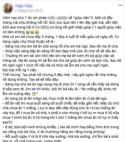 Thế nhưng thực tế thì sáng mẹ cho bé ăn ngủ xong mẹ đi chợ. Đi 1 vòng về vẫn thấy bà giúp việc đứng ở bếp xem điện thoại để em bé nằm khóc một mình. Mẹ nói thì bà giúp việc nói: "Ăn miếng đã, khóc thì ẵm nó xuống đây".
