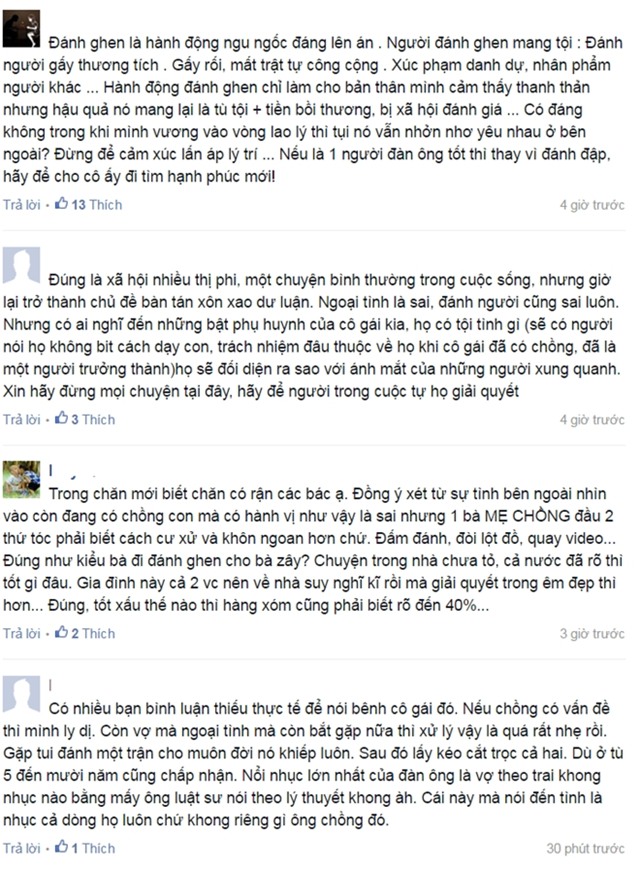 Đoạn video hiện thu hút 2,2 triệu lượt xem, 23.000 like (thích), 27.000 chia sẻ cùng hàng chục nghìn bình luận trái chiều. Nhiều ý kiến nhận định, cô gái đã sai khi có quan hệ ngoài hôn nhân. Nhưng không ít người cho rằng, việc sử dụng bạo lực khi đánh ghen là trái pháp luật.