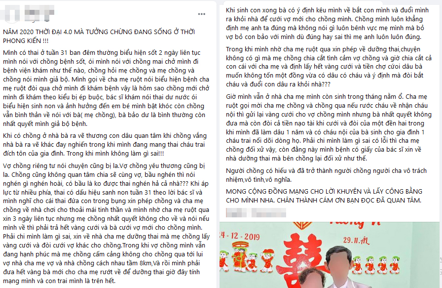 "Mình nhờ cha mẹ ruột qua xin 3 ngày liên tục nhưng mẹ chồng nhất quyết không cho về và nói nếu mình về thì phải trả hết vàng cưới và bà cưới vợ mới cho chồng mình... Và rồi mình phải đưa hết vàng bà mới cho cha mẹ đến rước về để dưỡng thai. Giờ đây tính mạng mình và con trai mình là trên hết" , P.T.V tâm sự đầy bức xúc.