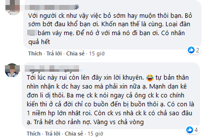 "Có thể bạn mới sinh nên suy nghĩ còn tiêu cực, kiểu yếu đuối còn muốn dựa dẫm chồng. Chứ chồng bạn như thế mà bạn gọi là hạnh phúc à? Rồi cha mẹ bạn xuống nước qua xin xỏ người ta bạn không thấy tội cho họ à? Mọi chuyện thành ra thế này rồi thì bạn đừng mong mà hàn gắn, đừng mong mà xin lại được vàng, không bao giờ có chuyện đó đâu. Tự lo cho bản thân và chăm lo cho con đi bạn. Không ai chia cắt được mẹ con bạn đâu. Công bằng hay không thì sau này trời tính còn giờ thì bạn lo mà nộp li hôn chia tài sản đi, 1 đồng cũng phải lấy lại", một độc giả đưa ra lời khuyên được nhiều người đồng tình.