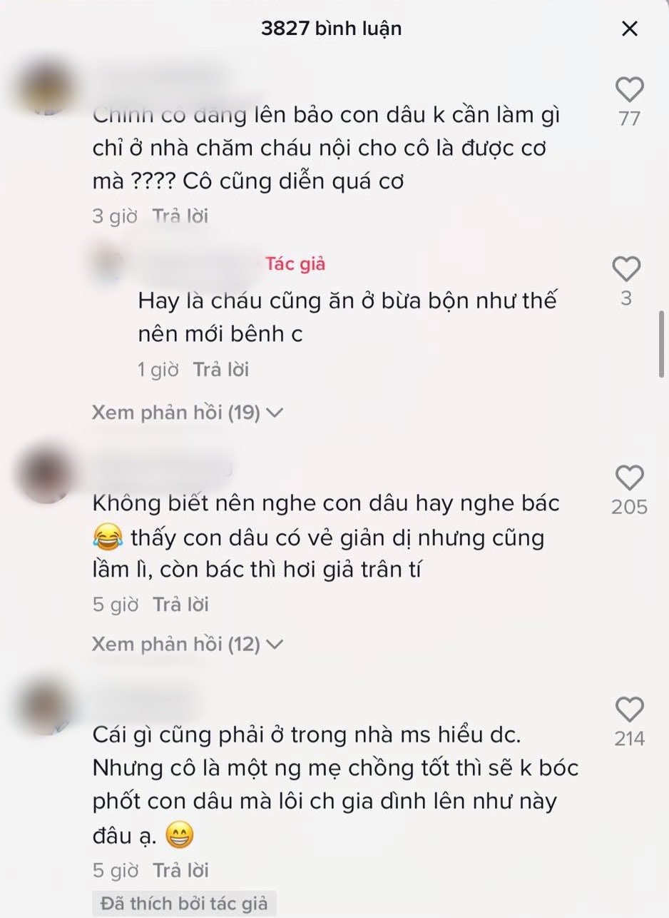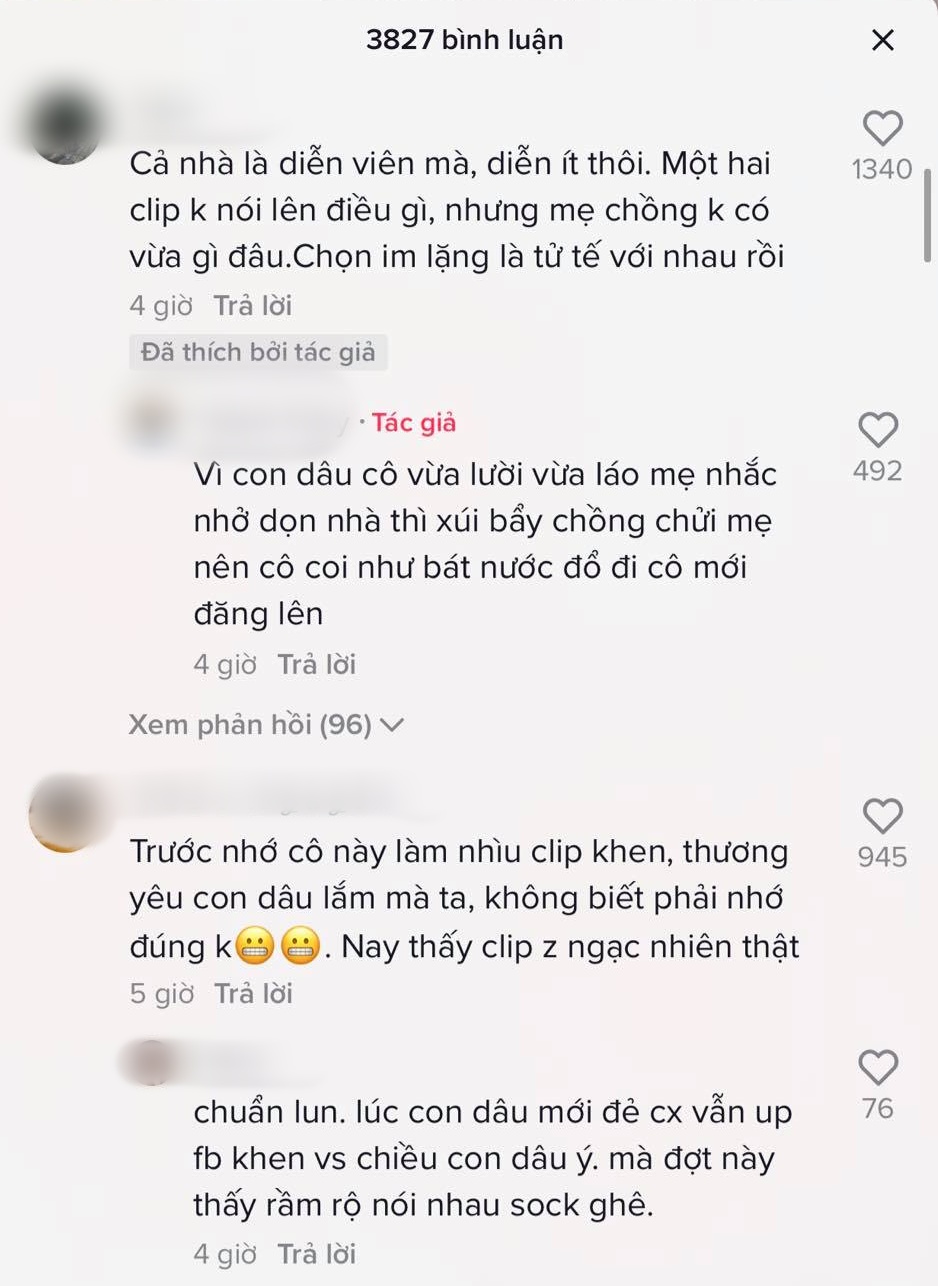 Về phía con dâu và con trai cũng xây dựng một kênh TikTok riêng. Cô con dâu cũng nhận về nhiều bình luận trái chiều. Đáp lại tất cả, cô con dâu trả lời: "Dạ thôi mình không nói gì nữa chị ạ, mặc".