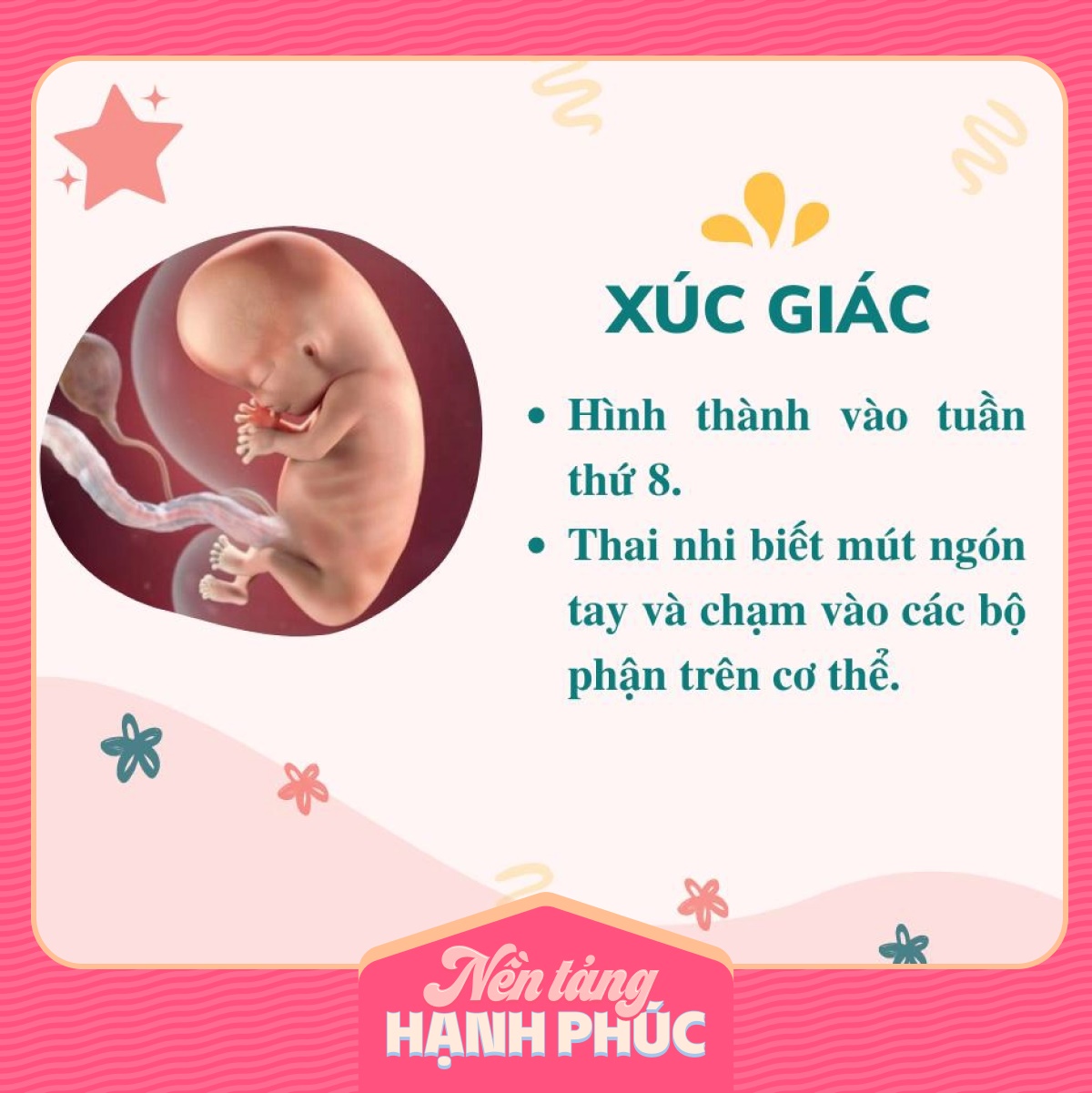 Giác quan này sẽ bắt đầu hình thành vào tuần thứ 8 của thai kỳ. Mẹ sẽ cảm thấy thật kỳ diệu nếu được chứng kiến thai nhi tự sờ vào mặt, mũi, thậm chí là mút ngón tay. Lúc này, con đã có thể cảm nhận được các bộ phận trên cơ thể và quan sát cách cơ thể mình chuyển động trong bụng mẹ.