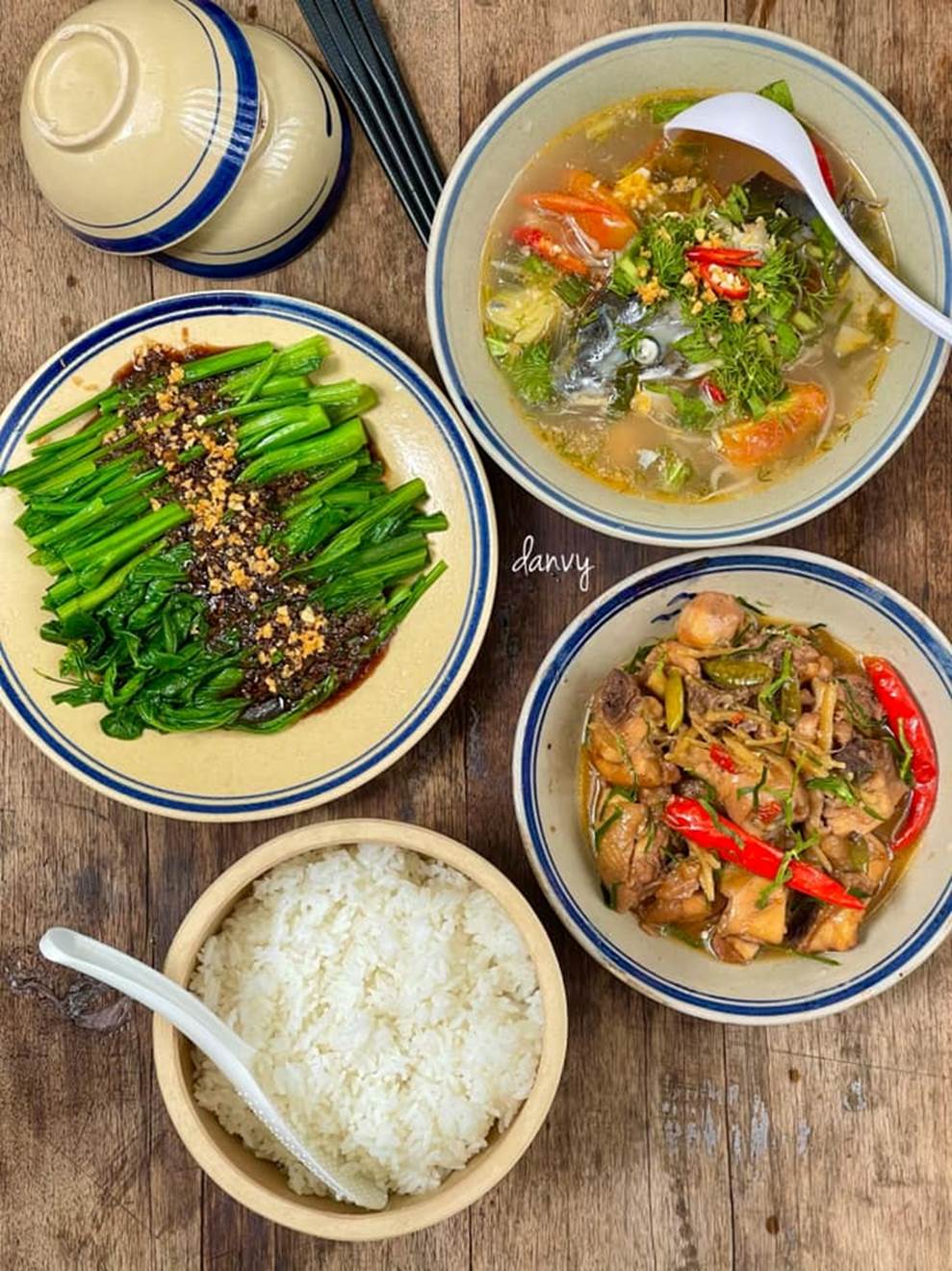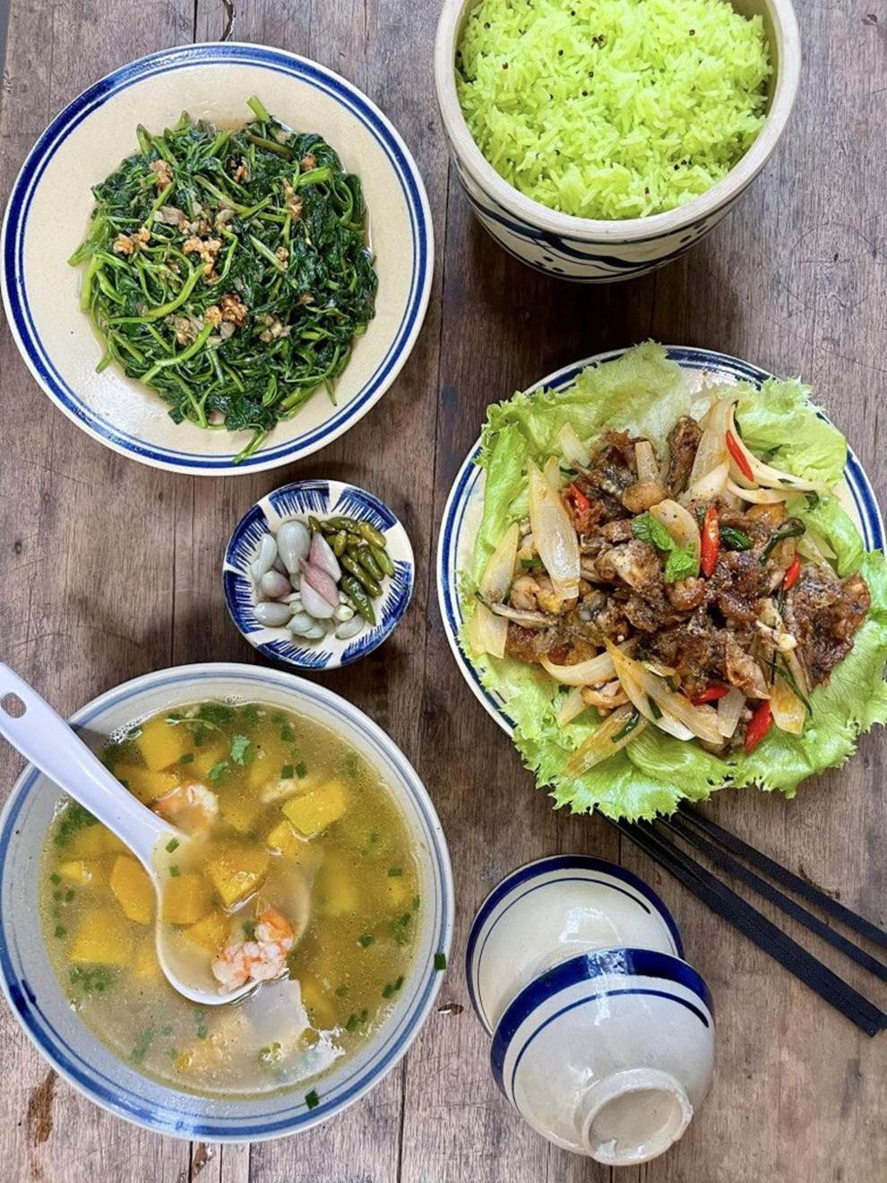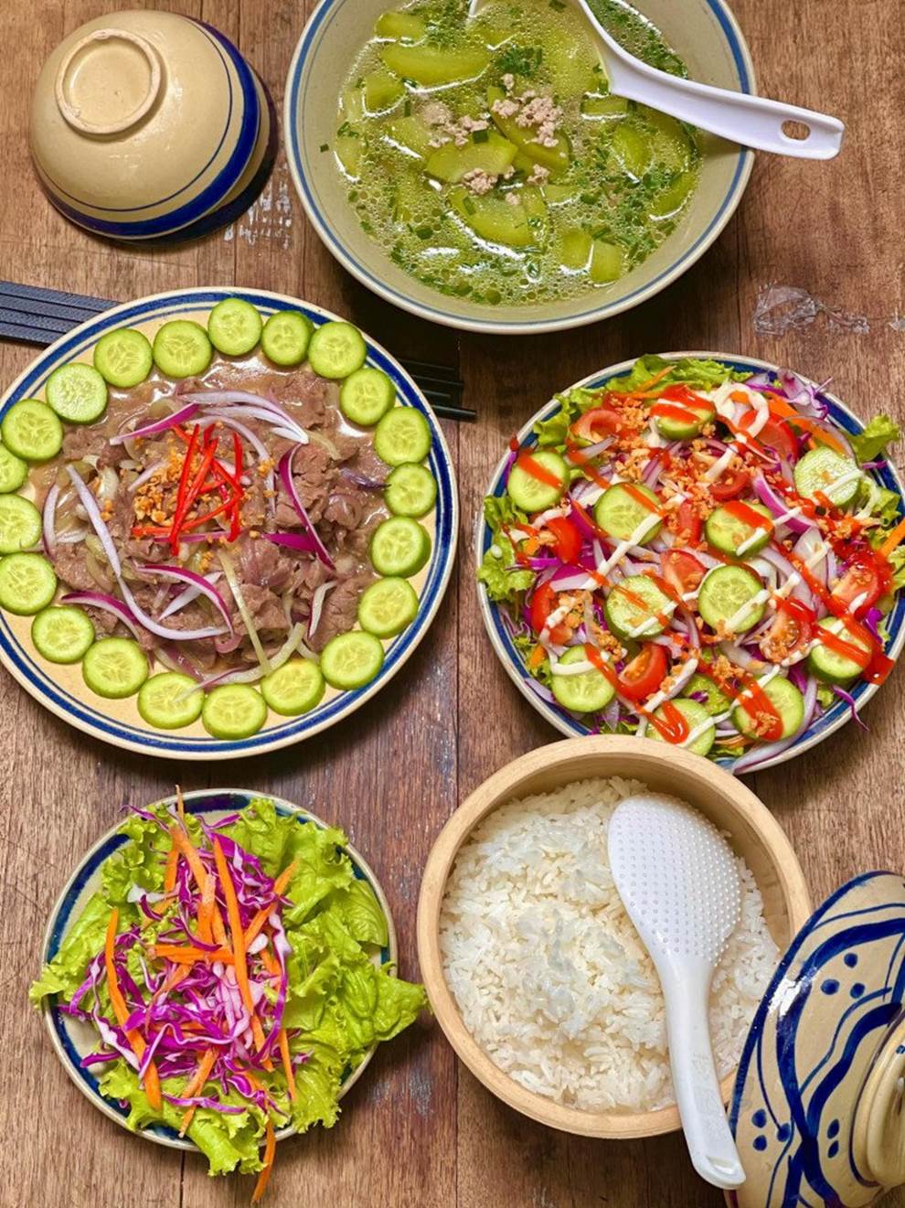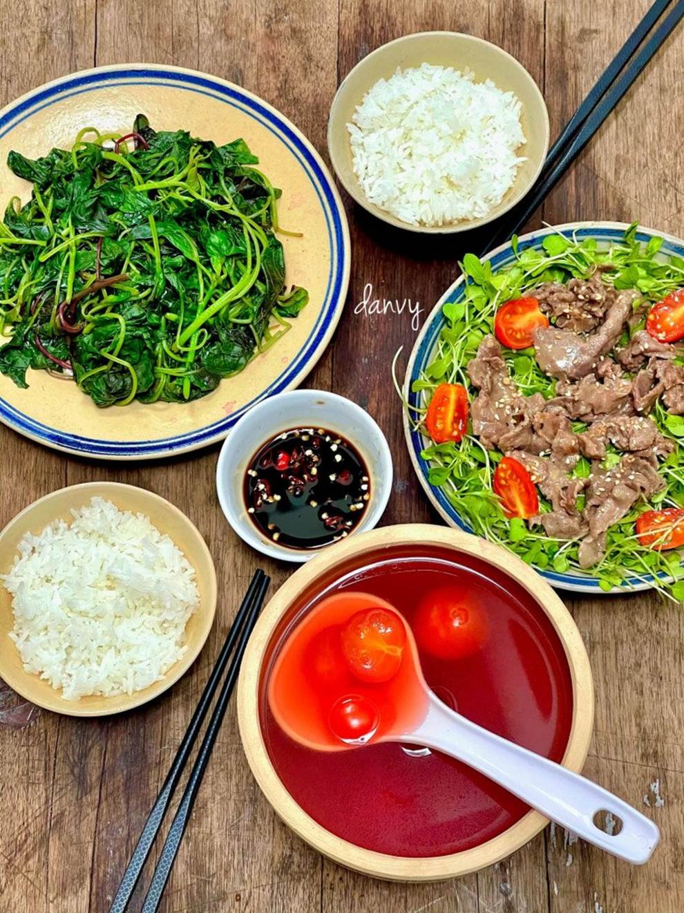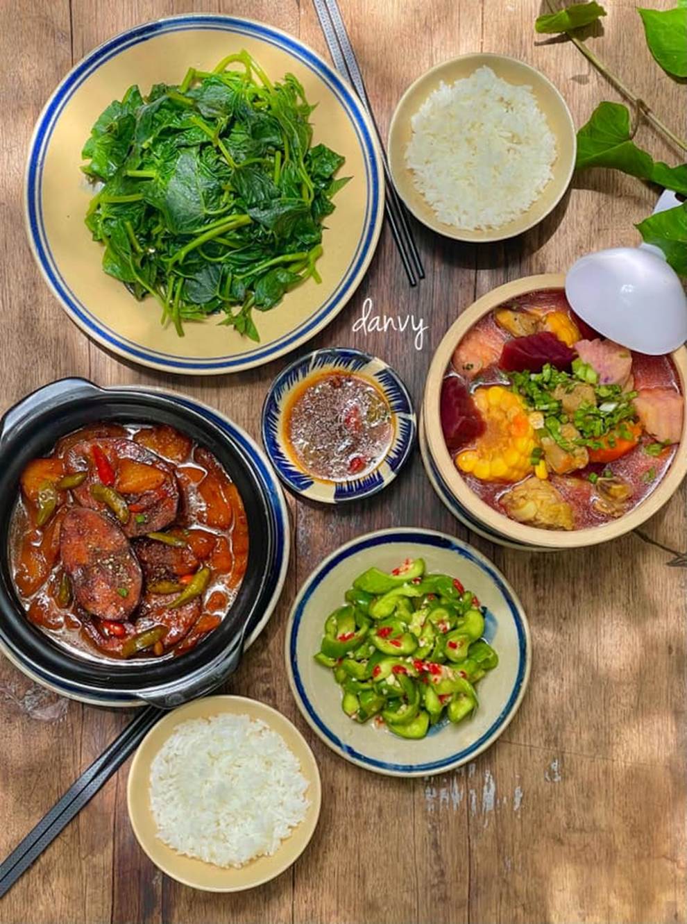 Dù nhà ít người song vì hai vợ chồng cần cung cấp nhiều năng lượng để có sức khỏe làm việc, chăm sóc con, còn con trai lại đang tuổi lớn nên chị Vy luôn cố gắng chuẩn bị đa dạng món nhất có thể. Chị cho biết, mỗi bữa mình nấu đặc biệt phải có rau xanh, còn thịt cá thì nấu xen kẽ mỗi ngày.