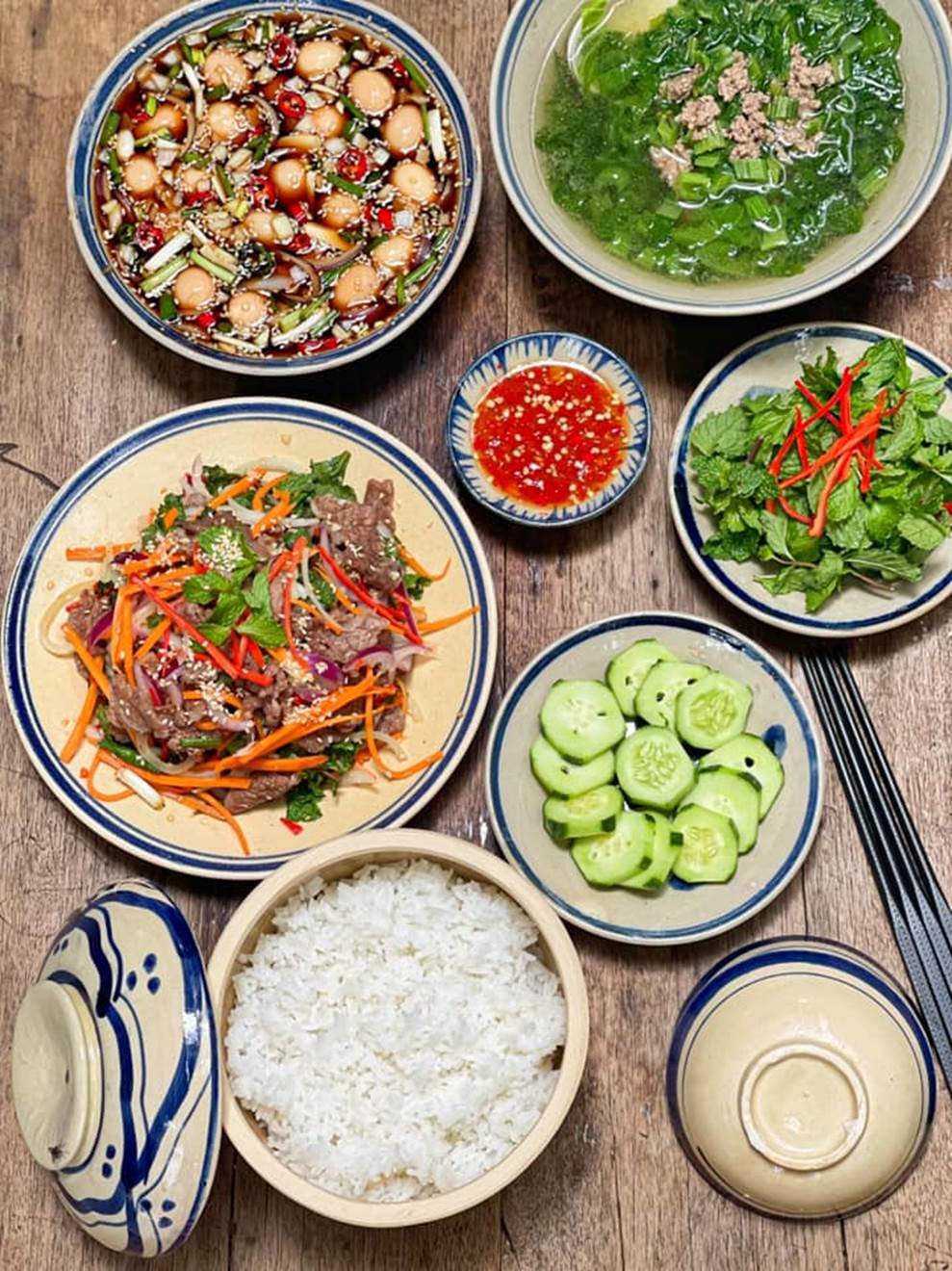 Khi nào rảnh rỗi, đặc biệt vào dịp cuối tuần, chị lại "đổi gió" cho cả nhà bằng các món bún, miến, phở, nui, mẹt các loại... Chẳng thế mỗi khi chị chia sẻ các món mình nấu lên mạng xã hội, ai cũng phải ngỡ ngàng và thèm thuồng vì nhiều món ngon lại đẹp mắt.