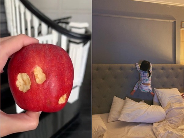 Cụ thể là, một buổi sáng Hà Tăng mở tủ lạnh ra định làm nước ép uống. Cô bất ngờ phát hiện ra trái táo giống như bị chuột gặm. Thụ phạm không ai khác, chính con gái Chloe.