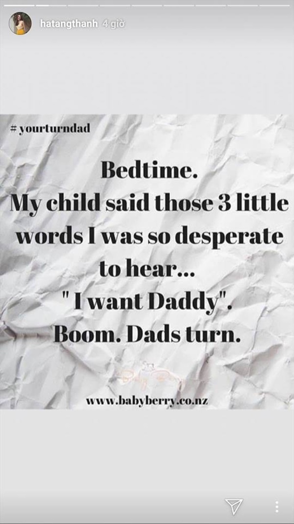 Đó là khi chăm con vất vả cả ngày đến giờ đi ngủ, giây phút được ôm con yêu nằm vùi trong lòng mẹ thì Hà Tăng bỗng nghe được 3 từ ngắn ngủi nhưng khiến cô đầy tuyệt vọng: "Con muốn bố".