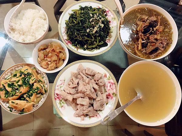 Mâm cơm của bà mẹ hai con Thu Hương nấu đầy đủ món rau, xào, canh, mặn, ai nhìn cũng bất ngờ.